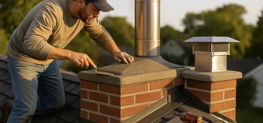 A proper crown protects the top courses. We form a reinforced, sloped crown with a drip edge and an expansion gap around the flue tile, preventing saturation and freeze damage in Edenbridge-Humber Valley, Etobicoke.